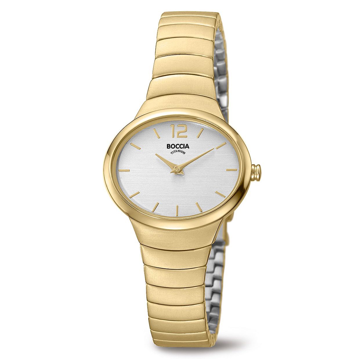 Boccia 3280-02 Horloge Titanium goudkleurig. Elegant dameshorloge uit de Boccia collectie. Het goudkleurig, titanium horloge heeft een ovale kast met zilverkleurige wijzerplaat. De goudkleurige horlogeband is voorzien van mat afgewerkte schakels en sluit door middel van een vouwsluiting. Door het gebruik van titanium is het horloge licht, allergievrij en heel comfortabel draagbaar.