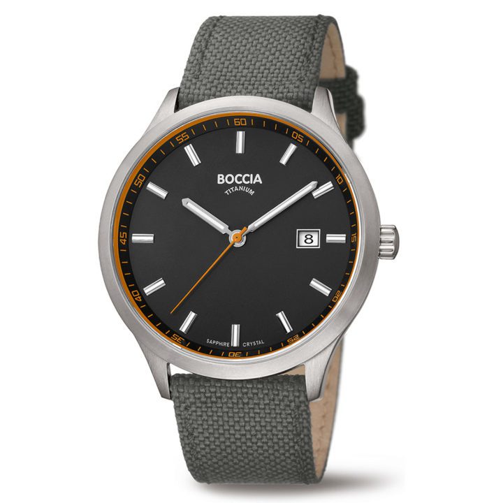 Boccia 3614-01 Horloge chronograaf titanium-nylon 43 mm. Titanium chronograaf horloge uit de Boccia collectie. Het horloge heeft een ronde, zilverkleurige, titanium kast met zwarte wijzerplaat en oranje accenten. Het horloge heeft chronograaffuncties, saffierglas, datumaanduiding en een oranje secondenwijzer. De grijze, nylon horlogeband sluit door middel van een gespsluiting. Door het gebruik van titanium is het horloge licht, allergievrij en heel comfortabel draagbaar.