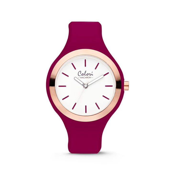 Colori Horloge Macaron staal/siliconen bordeauxrood 44 mm 5-COL509. De Macaron collectie van Colori bestaat uit horloges met een waterdichtheid van 5ATM. Het horloge heeft een diameter van 44 mm. De band is gemaakt van siliconen, waardoor het een fijn draagcomfort heeft. De collectie is verkrijgbaar in verschillende kleuren.