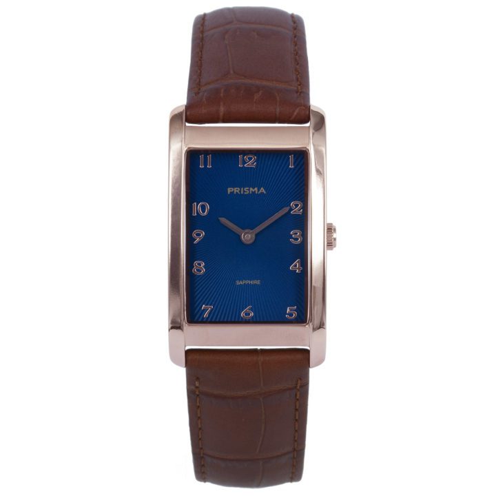 Prisma Dameshorloge rosé-goudkleurig P.1968 . Prachtig Prisma Dameshorloge voorzien van een bruine lederen band. Deze uitvoering heeft een blauwe wijzerplaat met arabische index. De bruine band past heel mooi bij de stijl van het horloge. De rechthoekige kast heeft een grootte van ca. 20-24mm. Het horloge is 5 bar waterdicht en u heeft 2 jaar garantie op het uurwerk.Wanneer kreeg u uw eerste Prismahorloge? Prisma is een begrip, een icoon en onlosmakelijk verbonden aan Nederland. Het eerste Prismahorloge werd gemaakt in 1948 met de wens om kwalitatief hoogstaande en elegante horloges op de markt te brengen voor een zeer betaalbare prijs. Prisma was een van de eerste merken die een quartz uurwerk in haar horloges ging gebruiken. De bekendheid van Prisma nam toe na de ontwikkeling van de rekband en de duidelijk leesbare wijzerplaten, waardoor het horloge zeer gewild werd bij vele ouderen. Tot de dag van vandaag is de vraag naar dit type horloge nog steeds erg groot. Prisma horloges worden gemaakt van staal of van titanium en zijn vaak voorzien van dat geweldig harde en vrijwel niet te bekrassen saffierglas. U heeft de keuze uit stalen of lederen banden. Een hoge kwaliteit voor een relatief lage prijs.