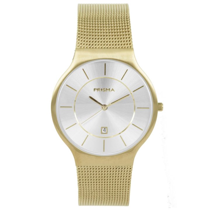 Prisma P.1803 Horloge Icon design staal goudkleurig. Prachtig Prisma Herenhorloge voorzien van een goudkleurige stalen band. Deze uitvoering heeft een zilverkleurige wijzerplaat met streepjes index. De goudkleurige band past heel mooi bij de -stijl van het horloge. De ronde kast heeft een grootte van ca. 35-39mm. Het horloge is 3 bar waterdicht en u heeft 2 jaar garantie op het uurwerk.Wanneer kreeg u uw eerste Prismahorloge? Prisma is een begrip, een icoon en onlosmakelijk verbonden aan Nederland. Het eerste Prismahorloge werd gemaakt in 1948 met de wens om kwalitatief hoogstaande en elegante horloges op de markt te brengen voor een zeer betaalbare prijs. Prisma was een van de eerste merken die een quartz uurwerk in haar horloges ging gebruiken. De bekendheid van Prisma nam toe na de ontwikkeling van de rekband en de duidelijk leesbare wijzerplaten, waardoor het horloge zeer gewild werd bij vele ouderen. Tot de dag van vandaag is de vraag naar dit type horloge nog steeds erg groot. Prisma horloges worden gemaakt van staal of van titanium en zijn vaak voorzien van dat geweldig harde en vrijwel niet te bekrassen saffierglas. U heeft de keuze uit stalen of lederen banden. Een hoge kwaliteit voor een relatief lage prijs.